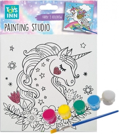 Descoperă bucuria creației cu setul de pictură cu motiv unicorn. Conține o pânză de 15 × 15 cm, o pensulă și 5 culori (alb, galben, roz, albastru, verde) – ideal pentru copii și începători. Pictură ușoară, dezvoltarea creativității și distracție în timpul liber într-un singur set.
