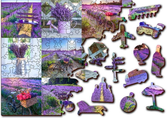 Asamblează după imaginea color a câmpurilor de lavandă sau încearcă partea din spate cu un model repetitiv pentru asamblare exclusiv după forme.