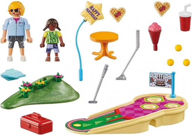 Acest set cadou jucăuș oferă un teren de minigolf complet, gata de acțiune imediată: rampă frontală pentru lovituri precise, trei găuri, tunel secret sub traseu și ondulație/moviliță verde ca provocare bonus. Două figurine detaliate țin ușor accesoriile datorită prinderilor practice – de la crosele de golf și băuturi până la balon.