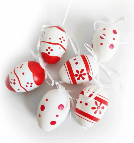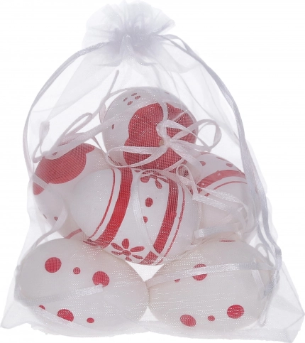 Ouă decorative din plastic pictate, cu dimensiunea de 6 cm, ideale pentru decorațiunile tale de sărbătoare. Primești 6 bucăți într-un săculeț elegant din organza.