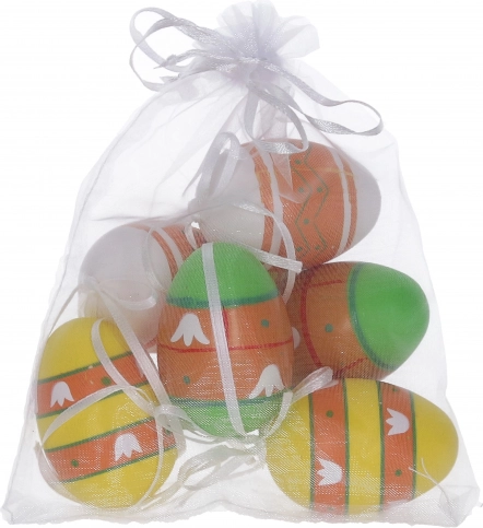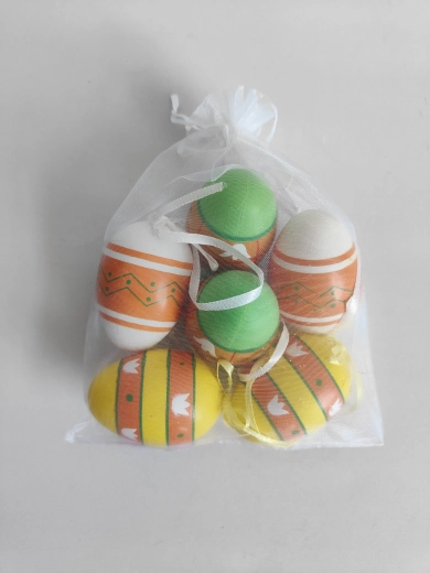 Înviorați-vă decorațiunile cu aceste frumoase ouă din plastic pictate, cu dimensiunea de 6 cm, ambalate câte 6 bucăți într-un săculeț elegant din organza.