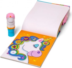 <p>Copil folosind ștampila în formă de unicorn pentru a decora hârtia cu motive magice.</p>