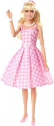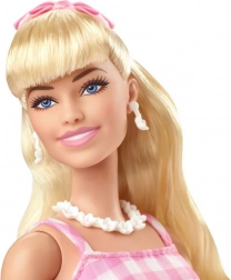 Această păpușă BARBIE de film se remarcă prin stilul atemporal și execuția detaliată. Are păr blond lung prins cu o panglică roz, completat de cercei și colier cu margarete. Rochia în carouri roz-alb, stil vintage este accentuată de fusta plisată și de curea, iar pantofii roz cu toc dau ținutei un plus de șarm.