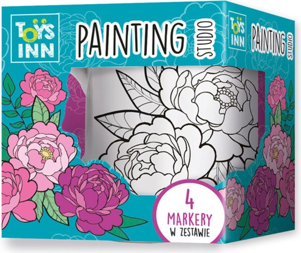 Descoperiți distracția creativă cu cana ceramică de colorat cu model de bujor. Copiii își pot decora personal cana cu ajutorul celor patru markere colorate: galben, roz, verde și mov.