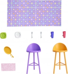 Sunt incluse 11 accesorii, inclusiv veselă, două scăunele, prosopel și păturică. Măsuța extensibilă din bucătărie extinde posibilitățile de joacă.