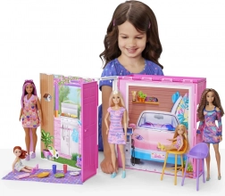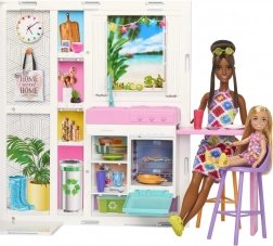 Sunt incluse păpușa BARBIE și 11 accesorii stilate – veselă, 2 scăunele, prosopel și păturică – care decorează interiorul și aduc idei noi de joc. Motivele grafice, precum colectarea selectivă a deșeurilor, plante, panouri solare pe acoperiș sau mașina electrică, îi învață discret pe copii despre ecologie.