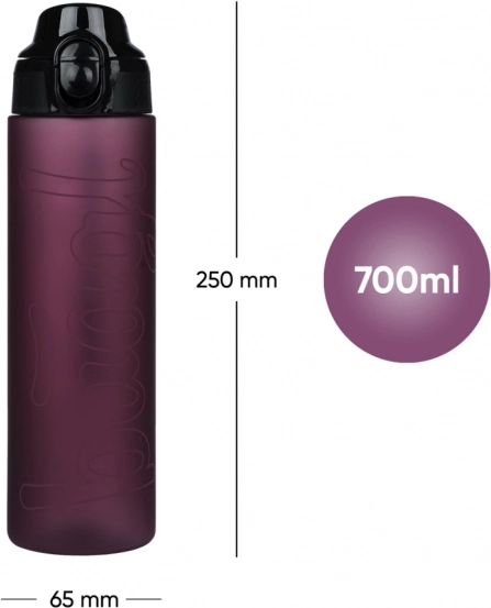 Capacitate de 700 ml într-un corp compact (aprox. 250 × 65 mm) care încape în rucsac și în suportul de sticlă. Ideală pentru școală și sport.