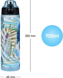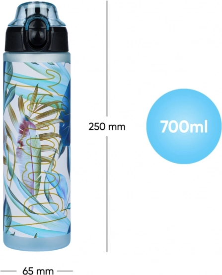 Sticlă de apă stilată și sigură pentru sănătate, din tritan certificat, pentru hidratare zilnică. Are capacitate de 700 ml, capac etanș cu blocare și deschidere rapidă, precum și curea pentru purtare confortabilă. Materialul este fără BPA, PVC și ftalați, nu reține mirosuri și este ideal pentru școală, serviciu, sport și excursii.