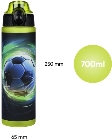 Imprimeu stilat cu tematică fotbal și riglă laterală pentru monitorizarea hidratării. Ideală pentru școală, antrenamente și călătorii.