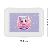 Cutia de prânz BAAGL, stilată și funcțională, îi încântă pe copii prin motivul vesel și pe părinți prin execuția practică. Capacul cu imprimeu colorat cu pisicuță se remarcă pe orice bancă școlară, în timp ce construcția solidă din plastic rezistent protejează gustarea de zdrobire.