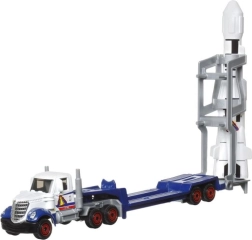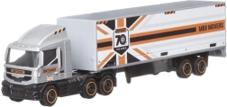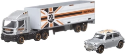 Capul tractor cu semiremorcă și mașinuța formează un duo de acțiune pentru scenarii de transport și logistică. Cabina poate fi detașată, iar ansamblul măsoară aproximativ 17,5 cm.