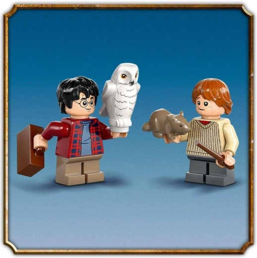 Sunt incluse minifigurinele Harry Potter și Ron Weasley, figurinele Hedwig și Scabbers, baghete și un geamantan – totul pentru aventuri magice.