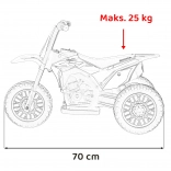 Operarea simplă cu deplasare înainte, efectele sonore de claxon și pornire vor aduce zâmbete fiecărui mic fan al motocrosului. Datorită dimensiunilor compacte (L 70 × l 41 × h 50 cm) și greutății de doar 4,6 kg, motocicleta este ușor de transportat și potrivită pentru copii cu sarcină maximă de până la 25 kg.