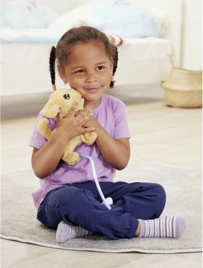 - Jucărie sigură pentru cei mici – cățelușul are 20 cm, are ochi mari brodați, negri, și un nas din plastic. Este îmbrăcat într-o pelerină de ploaie. Funcționează cu baterii (incluse în pachet).