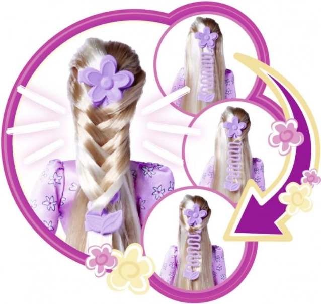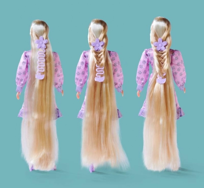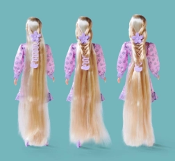 Părul lung și blond al păpușii oferă posibilități nesfârșite pentru aranjare și stilizare creativă.