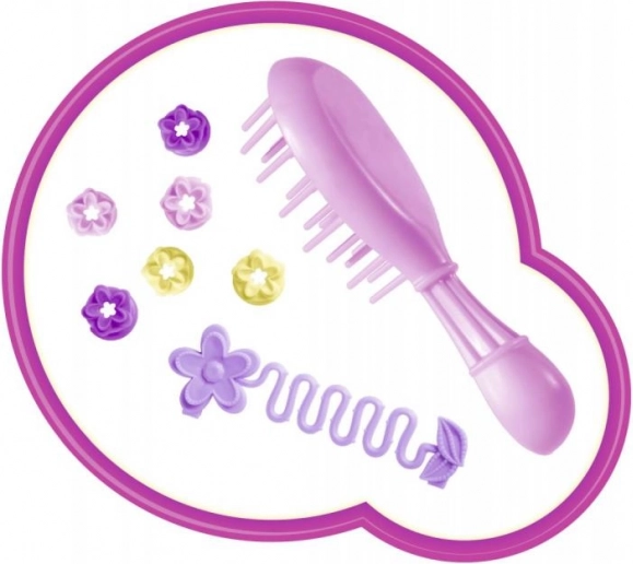 Păpușa vine cu agrafe în formă de flori care adaugă un plus de atractivitate aspectului său.