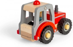 Acest tractor este conceput pentru a dezvolta abilitățile motorii ale copiilor. Construcția sa combină lemn natural cu lac roșu și gri, dându-i un aspect atractiv.