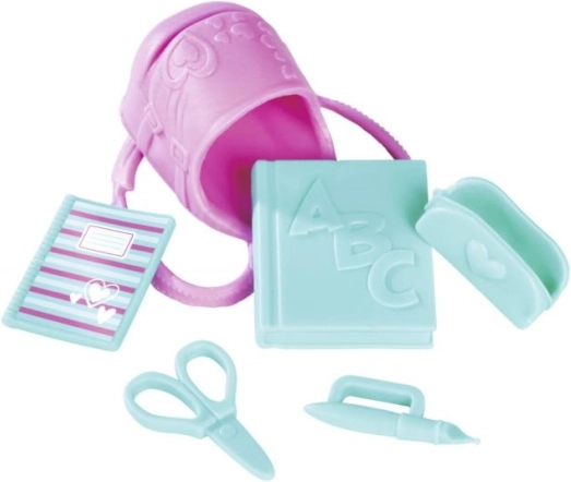 Include materiale școlare precum un caiet, foarfecă, penar, stilou și manuale pentru un joc realist.