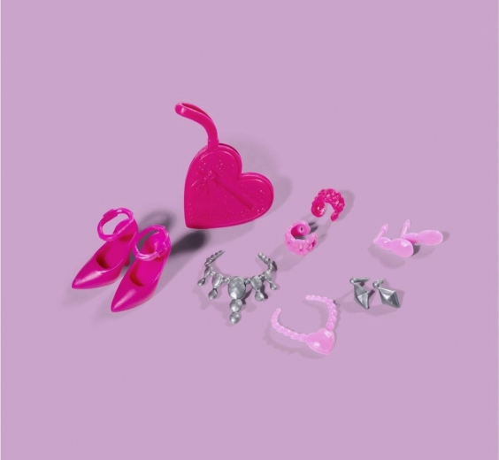 - Accesorii bogate: 2 coliere, 2 perechi de cercei, 2 brățări, poșetă în formă de inimă, pantofi cu toc.