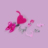 În pachet găsești 2 coliere, 2 perechi de cercei, 2 brățări, o poșetă în formă de inimă și pantofi cu toc pentru posibilități infinite de styling.