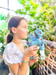 Unicornul nu doar că suflă bule, dar și cântă de fiecare dată când este apăsat declanșatorul.