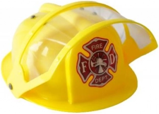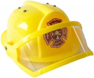 Casca galbenă, cu emblema pompierilor și linii curate, stimulează imaginația și conferă oricărui costum un aer profesionist.