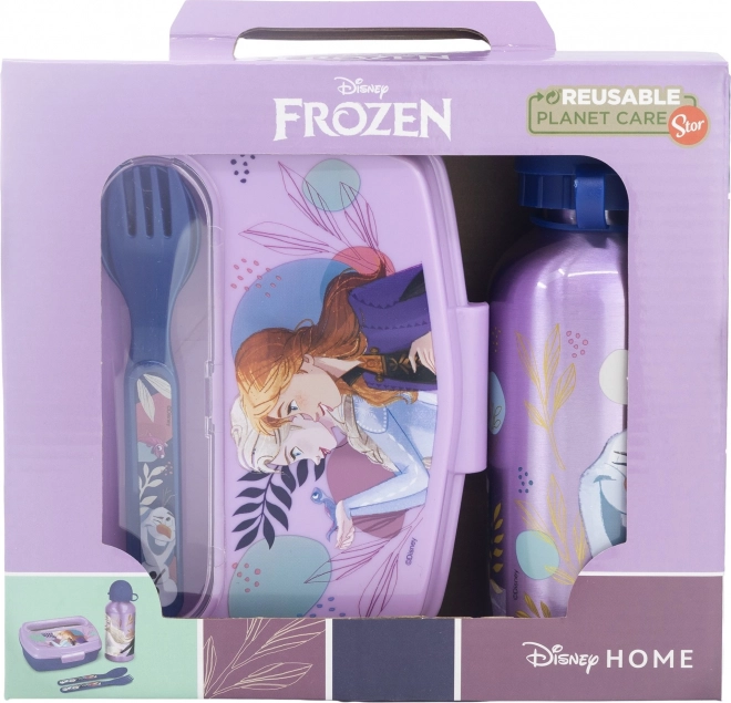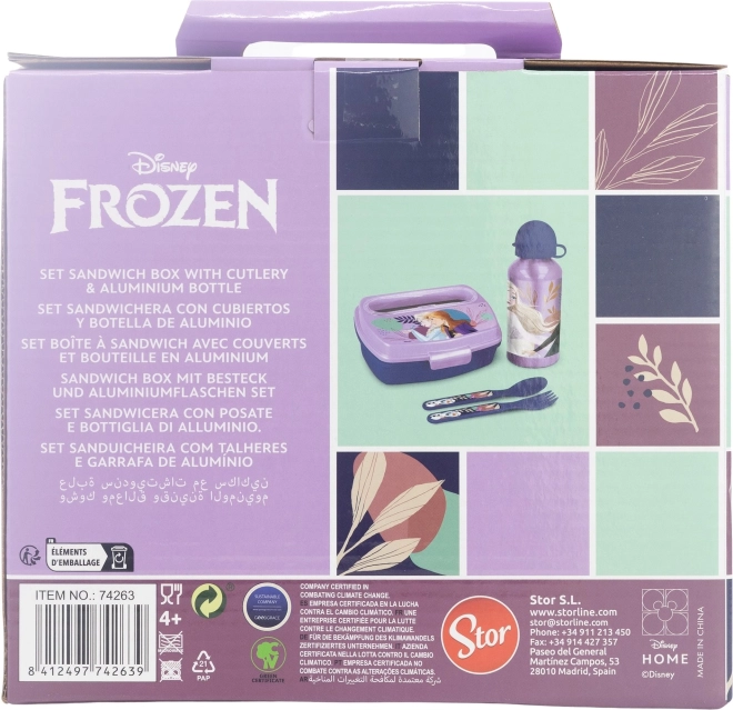 Set de masă pentru copii din 4 piese cu motivul REGATUL DE GHEAȚĂ de la STOR: include sticlă din aluminiu 400 ml, cutie pentru gustare și set de tacâmuri (linguriță și furculiță). Ideal pentru școală și excursii, fără BPA.