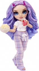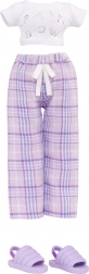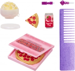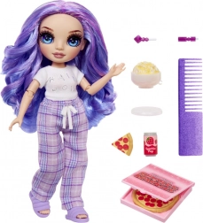 Violet are pijamale comode mov în carouri, papuci moi și un set de gustări – pizza, popcorn, farfurie și băutură. Ideal pentru scenete tematice și petreceri în pijamale.