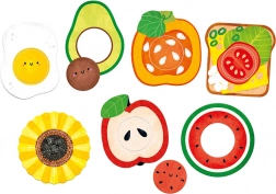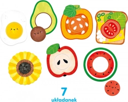 Jocul cu puzzle-ul dezvoltă în mod natural motricitatea fină, spiritul de observație și răbdarea. Împreună puteți denumi alimentele, culorile și formele, căuta asemănări și diferențe și inventa întrebări de tipul „Ce are sâmburi?” sau „Unde este oul?”. Copiii mai mari pot folosi piesele și pentru jocuri de magazin sau gătit, ori ca inspirație pentru propriile desene.