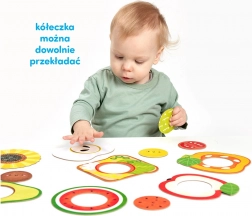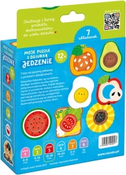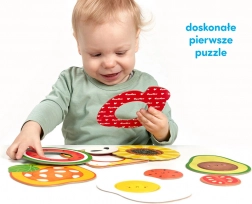 Primul puzzle pentru cei mai mici, care miroase a distracție! Setul conține 7 puzzle-uri mari din două piese pe tema mâncării, cu discuri interschimbabile. Datorită sistemului simplu de potrivire, asamblarea este intuitivă și motivantă. Susține motricitatea fină, concentrarea susținută, percepția formelor și culorilor și bucuria naturală a descoperirii.