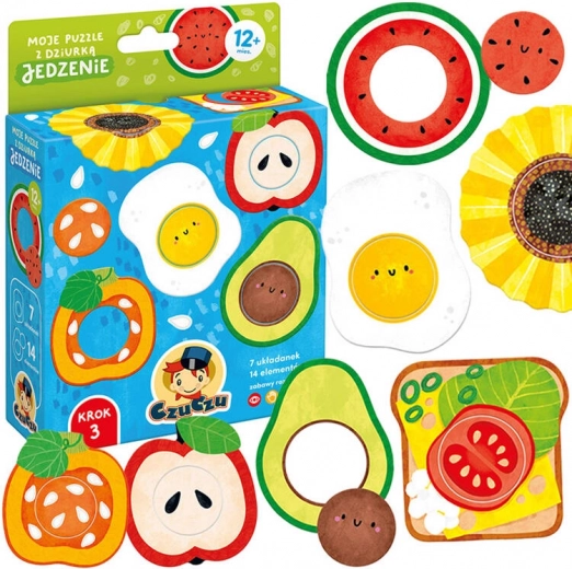 Puzzle-ul meu cu orificiu – mâncare este primul puzzle ideal pentru copiii mici. Piesele mari și rezistente, cu ilustrații vesele ale bunătăților preferate, invită la joc și învățare. Discurile interschimbabile pot fi introduse și „pe dos” sau între imagini diferite, rezultând combinații amuzante și neașteptate, pe care copiii le adoră.