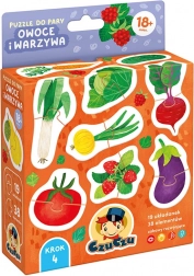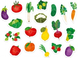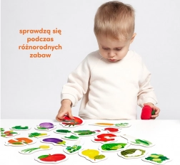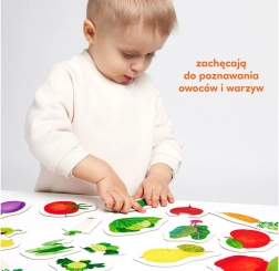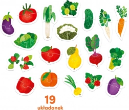 Pe puzzle-urile colorate sunt ilustrate bunătăți sănătoase din grădină și livadă. Căutarea și combinarea jumătăților este o activitate de dezvoltare versatilă, care îmbunătățește coordonarea mână-ochi și permite învățarea și consolidarea, într-un mod distractiv, a cuvintelor noi și a cunoștințelor despre lumea din jur.