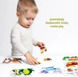 Acest puzzle colorat, plin de căldură și umor, este format din 4 piese. Este o alegere grozavă pentru copiii mici pregătiți pentru următorul pas în aventura lor cu puzzle-uri. Căutarea și potrivirea pieselor este un joc distractiv care dezvoltă spiritul de observație și îndemânarea mâinilor și sprijină cu bucurie învățarea de cuvinte noi.