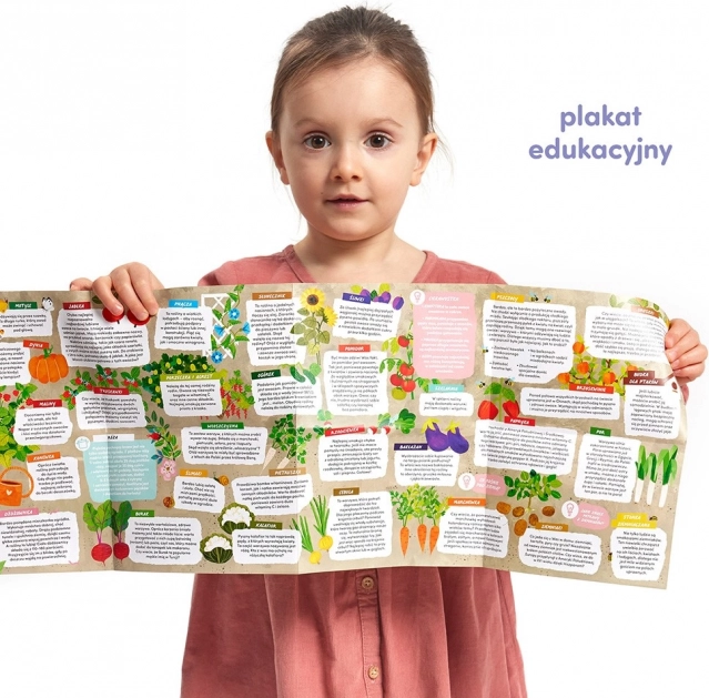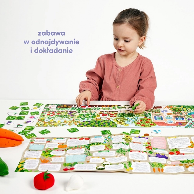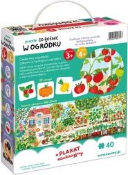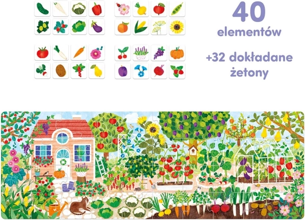 Puzzle-ul mare și intens colorat este format din 40 de piese și prezintă o grădină și o livadă în floare. Pe alte piese se află 32 de tipuri de fructe și legume pe care le poți potrivi. Acest lucru oferă o mulțime de distracție fascinantă și versatilă, ajutând la înțelegerea și memorarea a ceea ce crește în grădină. Vei găsi multe curiozități despre natură pe posterul inclus în puzzle. Setul educativ este o idee inspirată de cadou pentru un preșcolar curios.