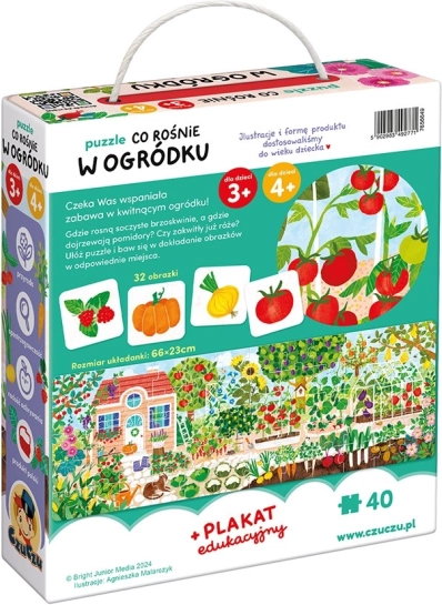 Puzzle-ul Ce crește în grădină este un set educativ unic pentru micii exploratori de vârstă preșcolară. Este alcătuit dintr-un puzzle mare cu 40 de piese și 32 de imagini precise, include în plus un poster educativ și permite multe moduri de joc creativ. Acordă o atenție sporită la ceea ce crește în straturi, pe arbuști și pe copacii din grădină!