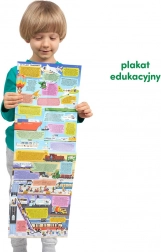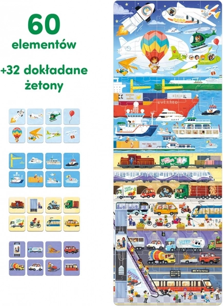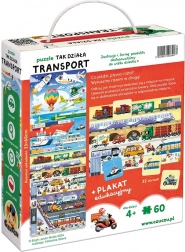 Puzzle-ul mare și colorat are 60 de piese și prezintă diverse mijloace de transport care transportă pasageri și mărfuri. Le recunoști pe toate? Pe posterul inclus în set vei găsi o mulțime de informații interesante despre transport, iar cele 32 de imagini cu elemente de căutat în ilustrație îți oferă și mai multă distracție creativă. Setul este o idee educativă de cadou ideală pentru un preșcolar curios, mai ales pentru fanii vehiculelor.
