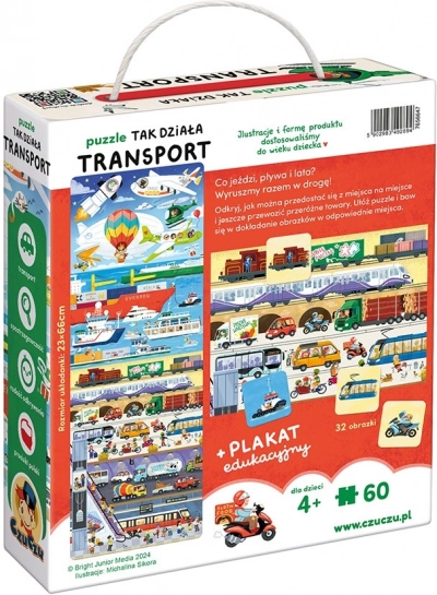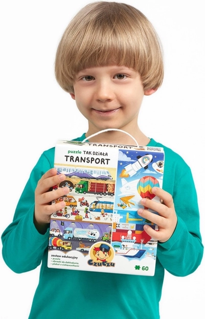 Puzzle-ul Așa funcționează transportul este un set educativ unic pentru copiii de vârstă preșcolară, mai ales dacă le plac diferitele vehicule. Este alcătuit dintr-un puzzle de 60 de piese, 32 de imagini corespunzătoare și un poster educativ. Hai să ne distrăm! Acordă atenție la ceea ce circulă pe drumuri, plutește pe apă și zboară în aer. Mijloacele de transport cunoscute și îndrăgite, dar și cele mai puțin evidente, sunt o motivație grozavă pentru joacă. Prin asamblarea puzzle-ului, copiii își dezvoltă într-un mod distractiv spiritul de observație, răbdarea și dobândesc cunoștințe noi. Distracție plăcută!