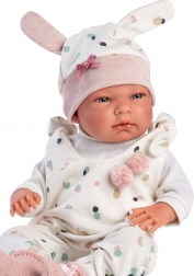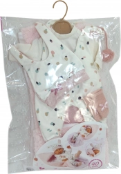 Culorile delicate și bulinele, împreună cu căciulița și botoșeii asortați, creează o ținută armonioasă pentru păpușa NEW BORN de 40–42 cm.