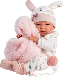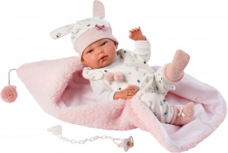 Păturica moale cu glugă și ciucure servește ca învelitoare și ca suport confortabil pentru păpușă – ideală pentru joacă acasă și în călătorii.