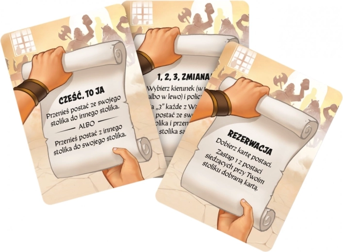 - Dacă ai cel puțin 1 monedă și la fiecare masă stă cel puțin 1 persoană, poți, în locul unui personaj, să tragi o carte de eveniment. Apoi citește cu voce tare conținutul ei și aplică efectul, după care o arunci.