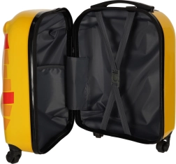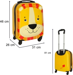 Un troler drăguț pentru copii cu motiv de leu, ideal ca bagaj de mână pentru micii călători. Are design durabil din carcasă de plastic, patru roți pentru manevrare ușoară și mâner telescopic. La interior oferă două compartimente – un buzunar cu fermoar și o zonă cu bretele elastice în X – astfel încât hainele și jucăriile preferate încap confortabil.