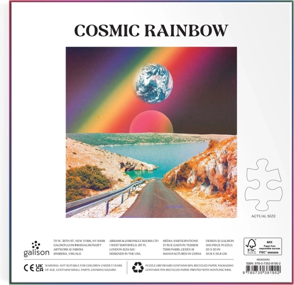 Scufundă-te în lumea culorilor și a fanteziei cu puzzle-ul GALISON Cosmic Rainbow de 500 de piese. Peisajul suprarealist cu curcubeu, planete și drum de coastă creează o scenă artistică puternică, care îi va încânta atât pe începători, cât și pe pasionații experimentați. Datorită tiparului de calitate și pieselor solide, asamblarea este fluidă și satisfăcătoare.