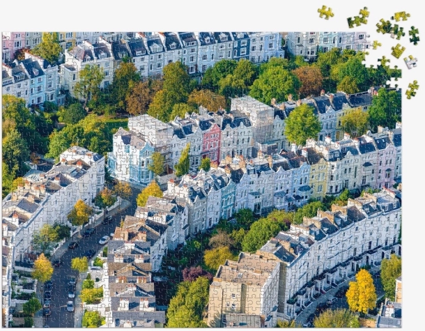Vederea aeriană asupra Notting Hill oferă o compoziție impresionantă de culori și detalii, plăcută în timpul asamblării și uimitoare pe perete după finalizare.