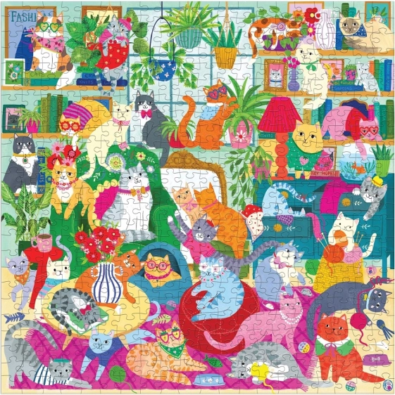 Puzzle-ul oferă o ilustrație colorată, plină de pisici în diverse culori și modele într-un mediu de acasă confortabil.