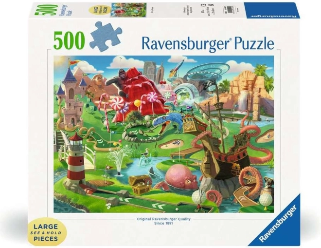 Descoperă bucuria asamblării cu puzzle-ul RAVENSBURGER cu motivul paradisului de minigolf. Piesele sunt extra mari pentru o manipulare mai ușoară, ideale pentru copii, seniori și persoane cu vedere slăbită. Cu aproximativ 500 de piese XXL de circa 3 cm, antrenezi motricitatea fină și răbdarea; imaginea finală măsoară aproximativ 70 × 50 cm.