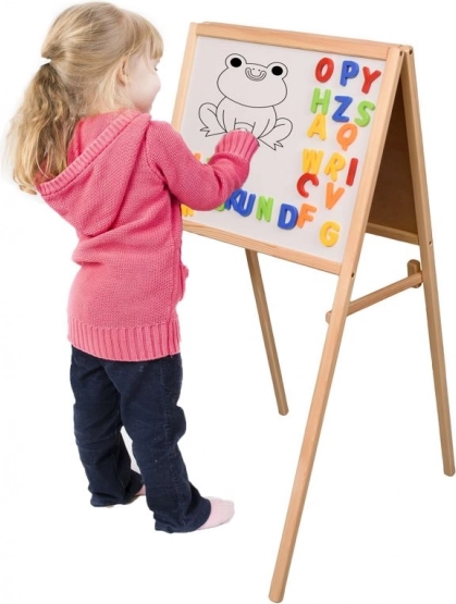 Susțineți creativitatea și învățarea prin joc. Tabla dublă pentru copii combină o suprafață cu cretă pentru desen clasic cu o față magnetică, cu ștergere la uscat, pentru scris cu markerul și lucrul cu magneți. Datorită celor două fețe, este ideală pentru dezvoltarea scrisului, cititului și socotitului.