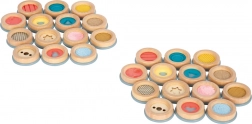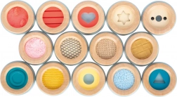 Acest pexeso tactil oferă o modalitate unică de a-i motiva pe copii să descopere diverse structuri și materiale. Fiecare disc din lemn are o textură diferită, datorită căreia jucătorii învață să potrivească elementele doar prin atingere. Jocul este ideal pentru copii de la 3 ani, susține motricitatea fină, concentrarea și cooperarea.