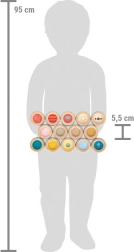 Setul include 28 de discuri din lemn cu inserții colorate și tactile pronunțate și un săculeț textil pentru depozitare. Datorită dimensiunilor compacte, jocul este grozav și pentru călătorii – acasă, la grădiniță sau în colțul de joacă.