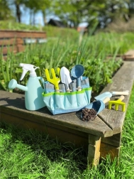 Șase unelte robuste (lopeți, săpăligă, lingură de grădinărit, greblă mică și furcă) cu mânere din lemn sunt concepute pentru micii grădinari.