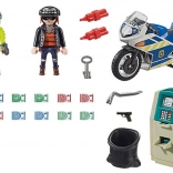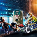 Setul de acțiune PLAYMOBIL din gama City Action aduce o urmărire palpitantă în oraș: polițistul pe motocicletă îl urmărește pe hoțul de buzunare care a spart un bancomat. În pachet găsești 2 figurine, o motocicletă, un bancomat, o rangă, un sac pentru pradă și bancnote – totul pentru aventuri urbane realiste.